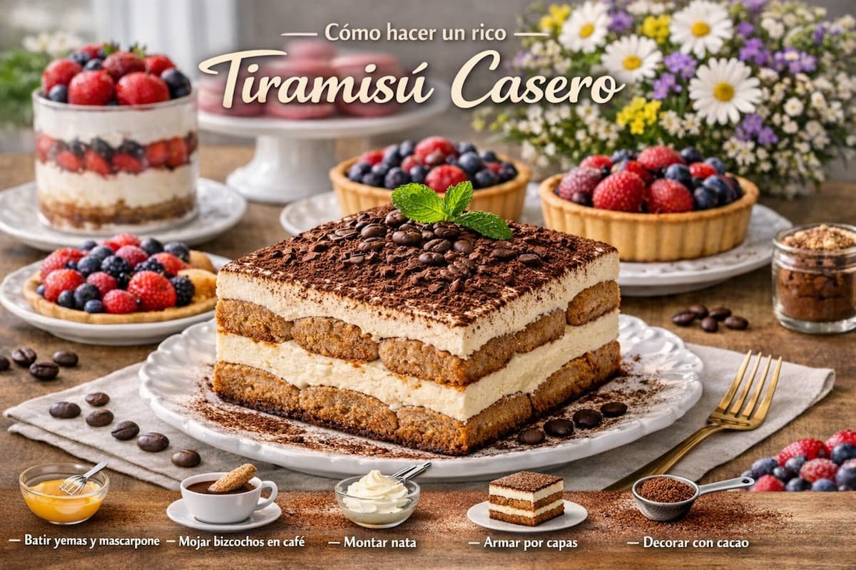 Aparte, montá la nata y mezclala con movimientos envolventes para mantener la ligereza. Prepará un café fuerte, dejalo enfriar y sumergí brevemente los bizcochos de soletilla. Alterná capas de bizcochos y crema en una fuente, terminando con una capa de crema. Refrigerá al menos 4 horas (ideal toda la noche) y decorá con cacao en polvo y, si querés, virutas de chocolate. Este postre no necesita horno y mejora con el tiempo, convirtiéndose en una delicia irresistible para cualquier ocasión.