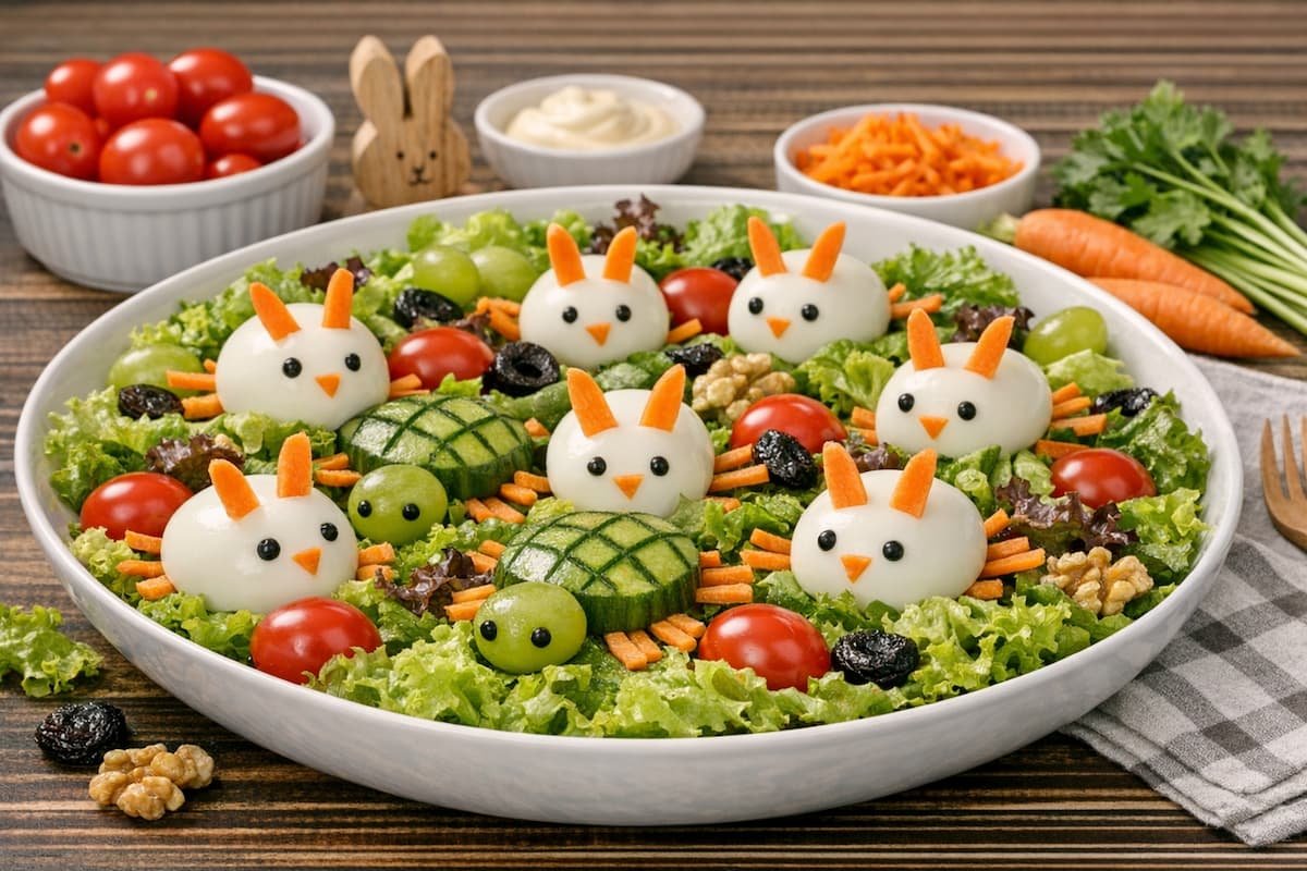 Corta los huevos por la mitad y usa pequeños trozos de aceituna para los ojos y triángulos de zanahoria para las orejas. Acompaña con la ensalada base.